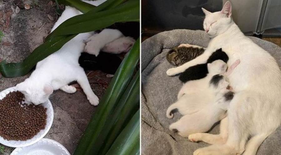 Se você encontrar uma gata amamentando seus bebês ao ar livre, isso ajuda a fornecer a ela comida, água e algum tipo de abrigo, para que ela possa amamentar seus bebês com segurança e não tenha que vagar muito em busca de comida.