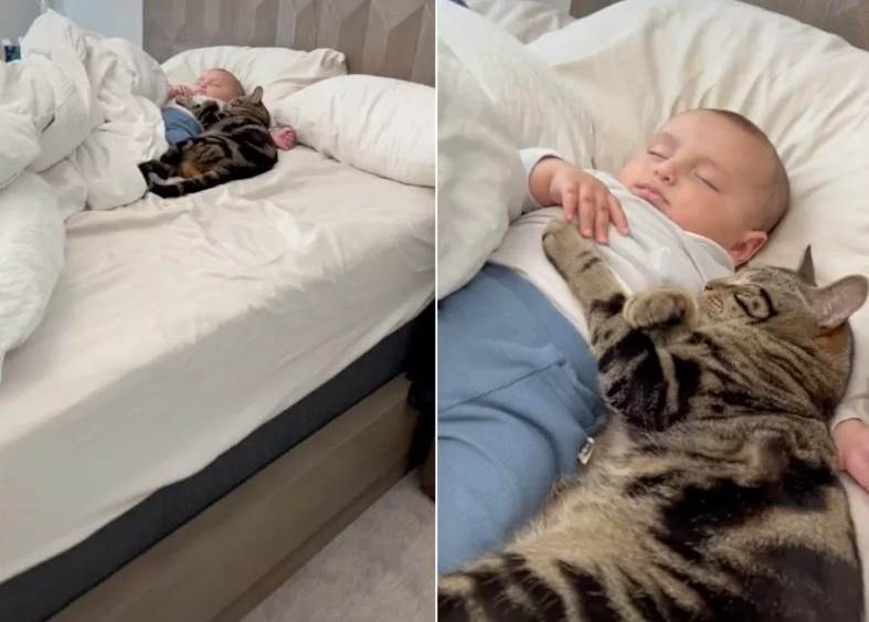 Um vídeo adorável de um gato tirando uma soneca com um bebê derreteu corações online, recebendo mais de 20 milhões de visualizações sobre o TikTok.