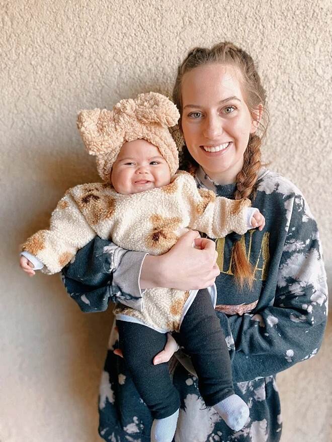 'Agora ele sempre quer estar perto dela. Ele dorme debaixo da cama dela. Assim que nos levantamos de manhã, e ele a ouve, ele pula na cama e fica deitado com ela enquanto eu troco sua fralda.