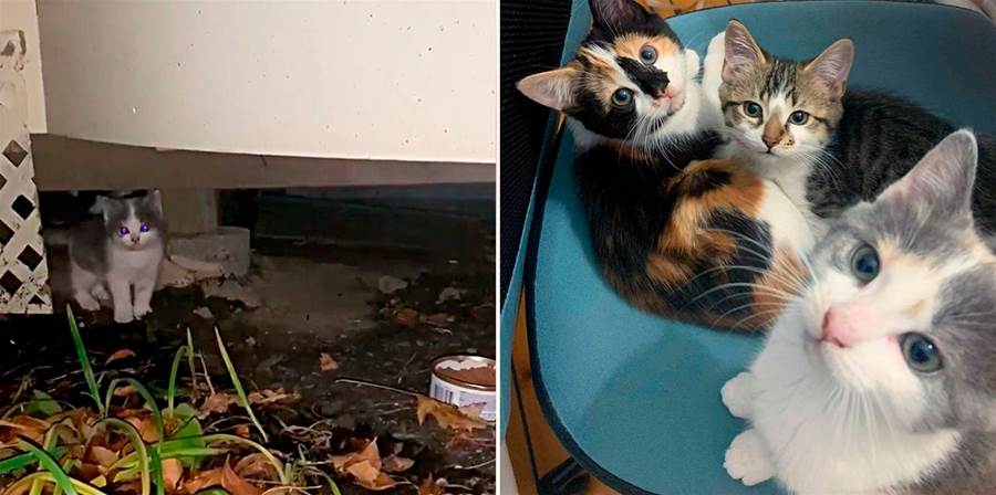 No final do ano passado, Steph e Francis de Montreal, Canadá, notaram um par de gatinhos brilhantes brilhando sob a varanda do vizinho uma noite. Após a inspeção, eles descobriram gatinhos pulando pela área.