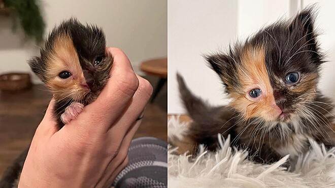 Mas o que chama atenção neste resgate é a pelagem da fêmea, que foi batizada de Apricot, a gata possui metade do rosto laranja e metade preta, como se fosse dois gatos diferentes.